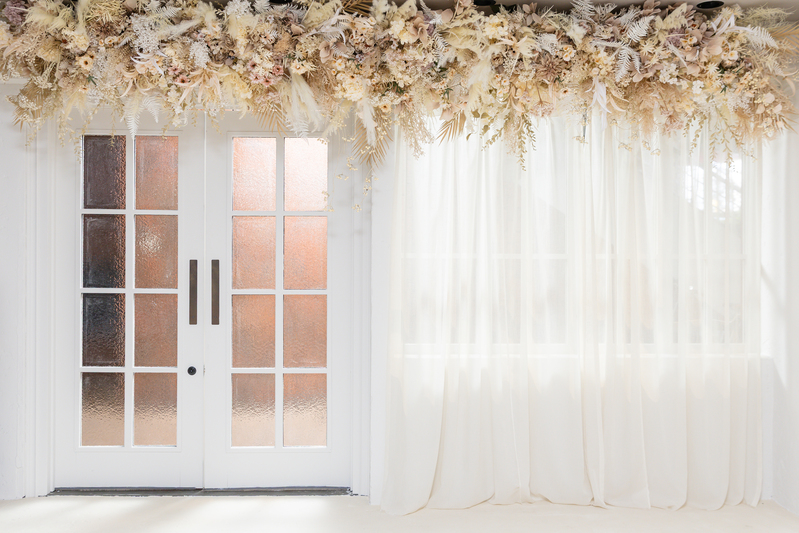 背景のアンティーク調の扉とドライフラワーが重なり合い、